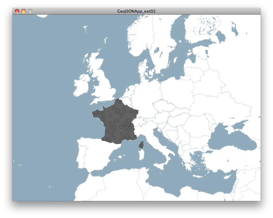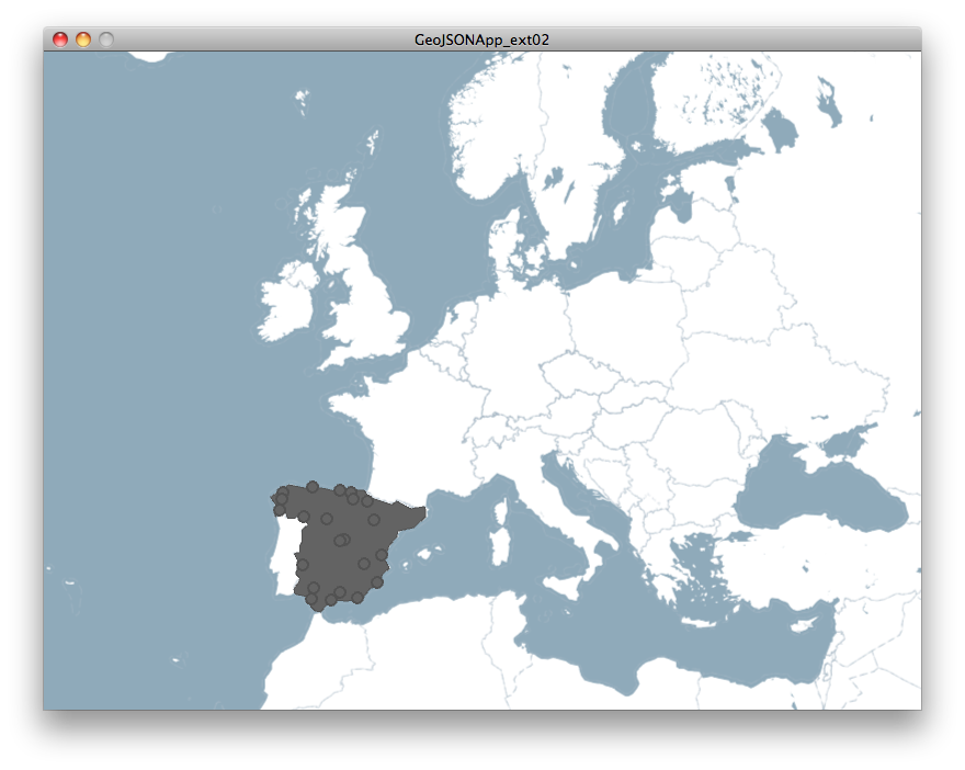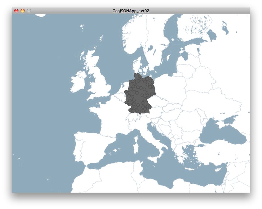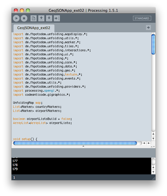 If you are done, let's think about, how we should handle the airports. My suggestion is to sort them into ArrayLists for each country one. Then we only have to call for that ArrayList and tell each airport inside to draw itself. Would be nice if this sorting could be done in advance, but the WorldAirports.geo.json lacks of meta information (properites), and the Unfolding library needs to draw a map to compare the locations of two features. Therefore we must do the sorting one time during runtime. Please, make a global boolean an set it on false: